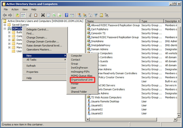 Con el botón derecho del ratón desplegaremos el menú y seleccionaremos la opción Nuevo seguidamente, buscaremos el objeto, OU o Organizational Unit.