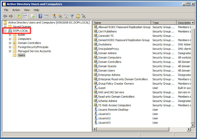 Para empezar con este sencillo procedimiento, en primer lugar accederemos a la consola de Usuarios y equipos de Active Directory. En nuestro ejemplo, seleccionaremos, en la parte superior del árbol, el nombre de nuestro dominio, en nuestro ejemplo es DOM.LOCAL.