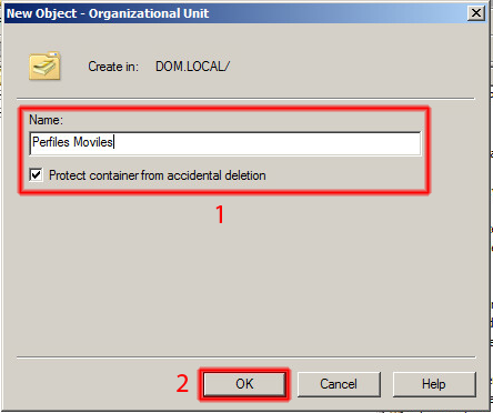 Asignaremos un nombre descriptivo a la nueva Organizational Unit y presionaremos el botón OK para finalizar. En nuestro laboratorio crearemos una nueva Unidad Organizativa para agrupar todos los usuarios que harán uso de los Perfiles Móviles, de nuestro entorno.