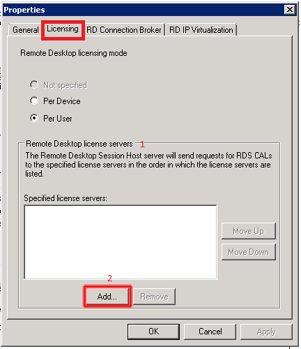 En la ventana Properties, comprobaremos que nos encontramos en la sección Licensing, en ella debemos buscar el recuadro Remote Desktop license servers y en el presionaremos el botón Add, para añadir el servidor de licencias que ya tenemos activo.