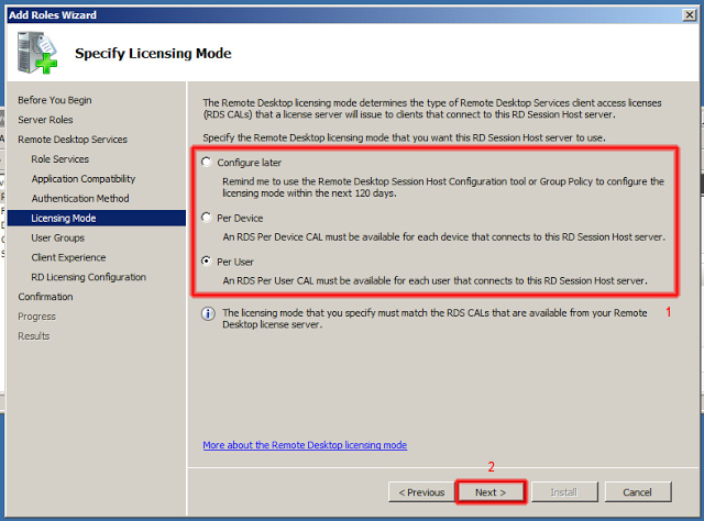 En nuestro entorno de ejemplo, seleccionaremos el tipo de licencias CAL Per User o Por usuario, hecho esto continuaremos el procedimiento pulsando el botón Next o Siguiente.