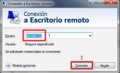 Desde un equipo conectado a nuestro dominio de Active Directory abriremos una ventana de Conexión a Escritorio remoto. En el cuadro de texto Equipo, escribiremos el nombre de nuestro servidor de Escritorio Remoto, en nuestro laboratorio se llama W2008-TS. Para realizar la conexión presionaremos el botón Conectar y esperaremos que el cliente de escritorio remoto contacte con el servidor de Terminal Services.