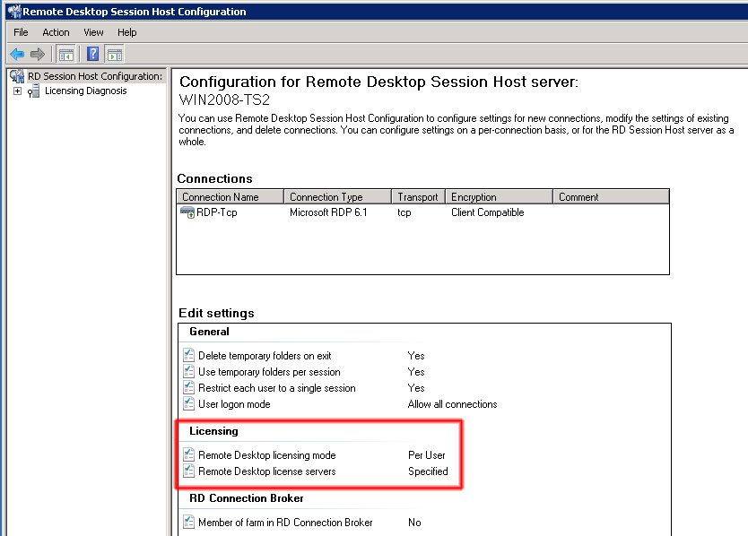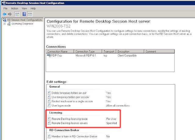 Lo siguiente deberemos hacer sera configurar nuestro servidor Remote Desktop Server para que haga uso de nuestro servidor de licencias recién configurado y activado. Esto lo haremos desde la herramienta llamada Remote Desktop Session Host Configuration.