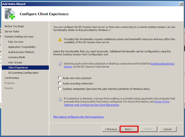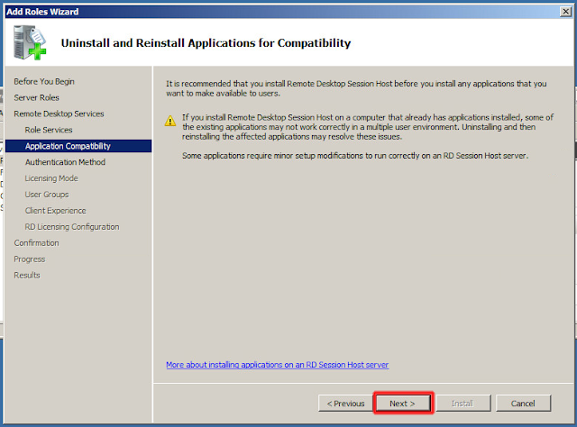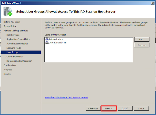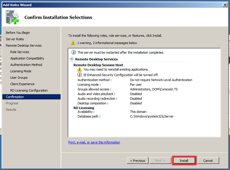 Habiendo terminado todas las configuraciones anteriores, pulsaremos el botón Install, para proceder a instalar los Servicios de Terminal Services en nuestro equipo.