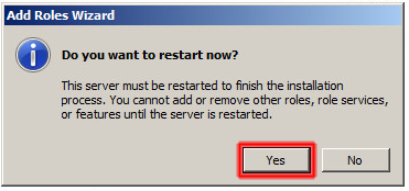 Nos aparecerá una ventana de advertencia preguntándonos si queremos reiniciar el servidor en este momento, podemos continuar sin problemas, presionaremos el botón Yes y reiniciaremos el servidor.