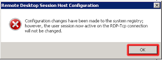 Nos aparecerá una ventana informándonos que los cambios de configuración se han realizado en el registro del sistema, la sesión del usuario activo en la conexión RDP-Tcp no será modificada. Cerraremos la ventana haciendo uso del botón OK.