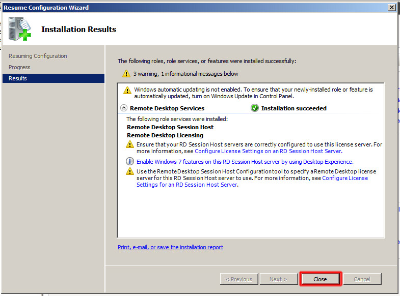 Finalizado el proceso, podemos ver que tenemos algún problemilla con el servidor de Licencias de Terminal Server, no os asustéis, de momento es normal, presionaremos el botón Close para terminar.