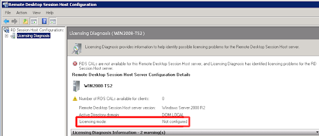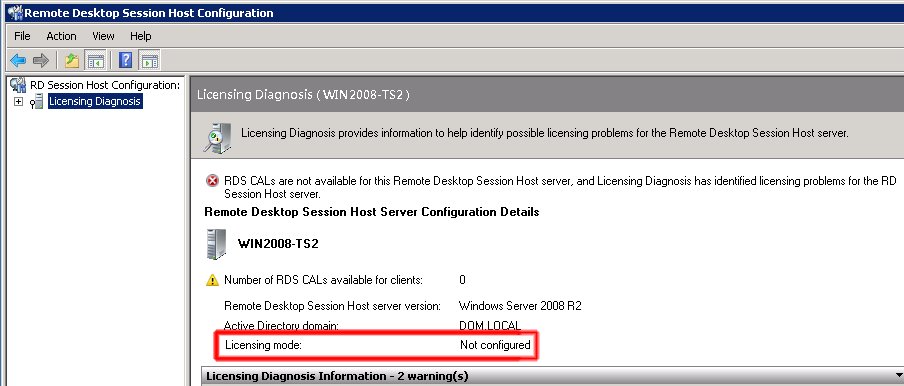 Accederemos a ella y de este modo podremos comprobar que, en la ventana central, en la sección Remote Desktop Session Host Server Configuration Details, la opción Licensing Mode no está configurada.