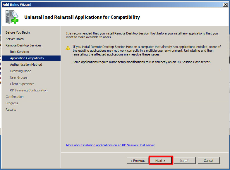 El siguiente paso del asistente será configurar la compatibilidad con los distintos clientes de Terminal Services, presionaremos el botón Siguiente para saltar la sección Uninstall and Reinstall Applications for Compatibility y así podremos acceder a la próxima sección del asistente de instalación.