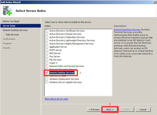 En la sección del asistente llamada Select Server Roles, buscaremos y seleccionaremos el rol que queremos instalar, en nuestro ejemplo será el rol llamado Remote Desktop Services.