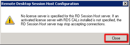 Nos aparecerá una advertencia, “no tenemos servidor de licencias especificado”, presionaremos el botón Close, para cerrar la ventana de la advertencia y proceder a especificar un servidor de licencias de escritorio remoto.