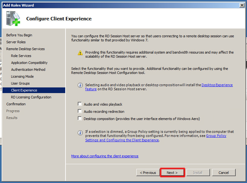 En Windows Server 2008 R2, el contenido de audio y vídeo, que se reproduce mediante el Reproductor de Windows Media, se redirige desde el servidor Host de sesión de Escritorio remoto hacia el equipo cliente en su formato original y se presenta mediante los recursos del equipo cliente. Otro contenido multimedia, como Silverlight y Windows Presentation Foundation, se presenta en el servidor. A continuación, los mapas de bits se comprimen y envían al cliente.