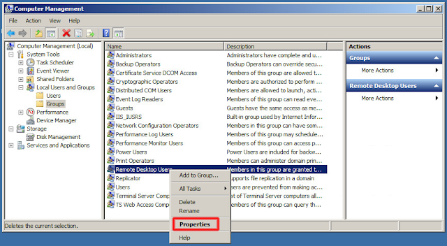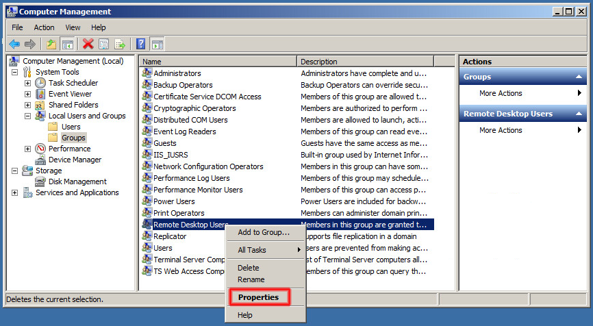 Con el botón derecho del ratón desplegaremos el menú desplegable y accedemos a las Properties del nuevo grupo local Remote Desktop Users.