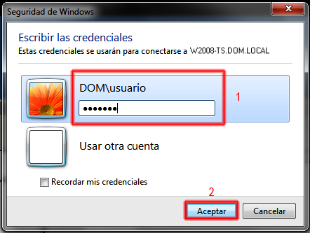 Para culminar la conexión con el servidor, nos solicitará las credenciales de acceso, introduciremos el nombre de usuario y la contraseña de uno de los usuarios incluidos el en grupo de usuarios con acceso a los servicios de escritorio remoto de nuestro servidor, pulsaremos el botón Aceptar para conectar con el servidor.