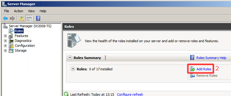 En la ventana central de Server Manager, en la sección Roles Summary, seleccionaremos la opción Add Roles, para agregar el nuevo rol de Servicios de Escritorio Remoto o RDP.
