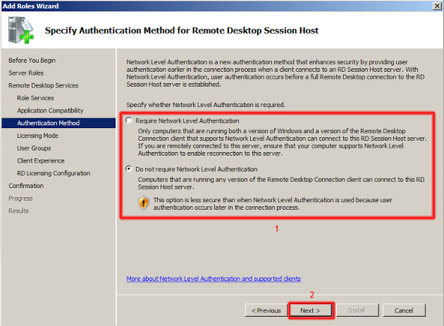 Para nuestro entorno de laboratorio no vamos a usar el Network Level Authentication, así pues, seleccionaremos Do not require Network Level Authentication, y seguidamente pulsaremos el botón Next o Siguiente para continuar el asistente.