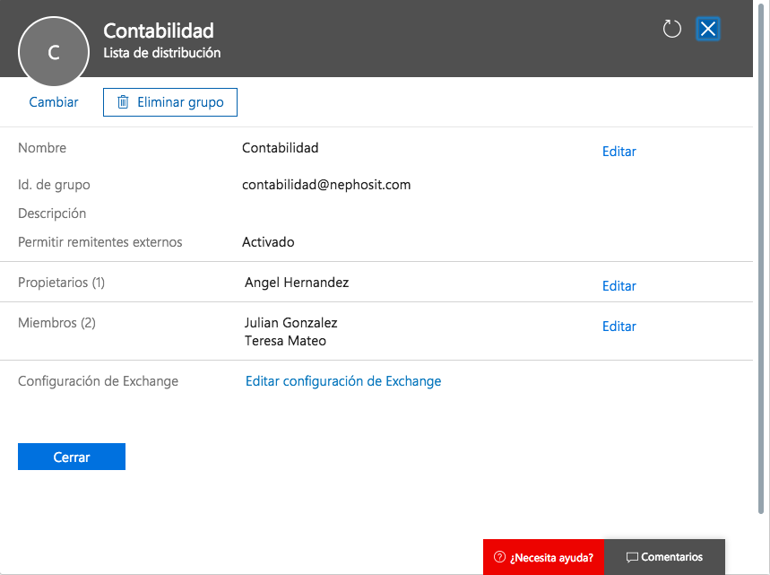 2. Una vez dentro se nos muestran todas las listas de distribución que tenemos creadas en nuestro dominio de correo, procederemos a seleccionar la que vamos a utilizar y nos abre la ventana con la información de la lista como nombre, id de grupo, propietarios y miembros